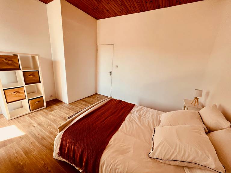 - une chambre avec un lit 140x190, avec un bureau/coiffeuse, une penderie et une étagère